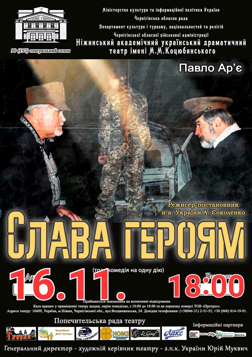 16 листопада 2022 р. о 18.00 Ніжинський академічний український драматичний театр ім.М.Коцюбинського запрошує Вас на виставу за твором Павла Ар'є ''Слава героям'', режисер-постановник - н. а. України Алла Соколенко.