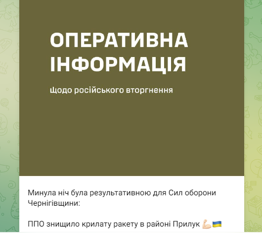 "Минула ніч була результативною для Сил оборони Чернігівщини: ППО знищила крилату ракету в районі Прилук", - ідеться у повідомленні.