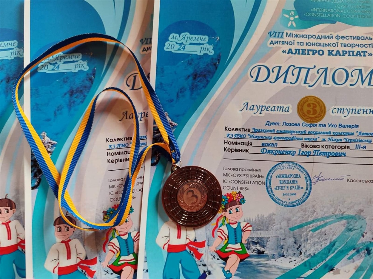 Учні 7 класу Ніжинської хореографічної школи - учасники Зразкового аматорського ансамблю бального танцю "Шанс" /балетмейстер Ірина Мірошник/ та Зразкової аматорської вокальної студії "Автограф" /керівник Ігор Дяконенко/ - гідно представили рідну школу та місто на Міжнародному фестивалі-конкурсуі дитячої та юнацької творчості «Алегро Карпат» та вибороли вагомі творчі нагороди: