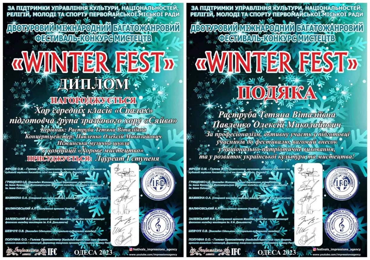 - Лауреат I ступеня (ДВОТУРОВИЙ МІЖНАРОДНИЙ БАГАТОЖАНРОВИЙ ФЕСТИВАЛЬ-КОНКУРС МИСТЕЦТВ «WINTER FEST» Україна, м. Одеса);