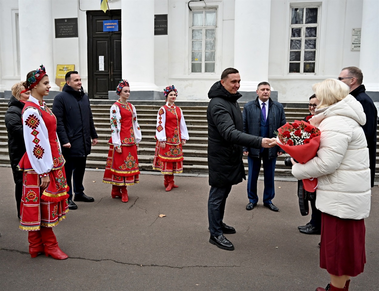 До Ніжина з офіційним візитом завітали представники Консульства Республіки Польща в Україні: консул Павел Овад, віце-консулка Анна Бабяк-Овод та редакторка єдиної польськомовної газети в Україні, «Дзеннік Кійовскі», Анжеліка Плаксіна. Урочиста зустріч гостей відбулася біля старого корпусу Ніжинського державного університету імені Миколи Гоголя, де делегацію радо зустрічали керівники міста й викладачі університету. Ректор вишу розповів про історію закладу та його важливі віхи, захопивши гостей цікавими фактами з життя ніжинської альма-матер.