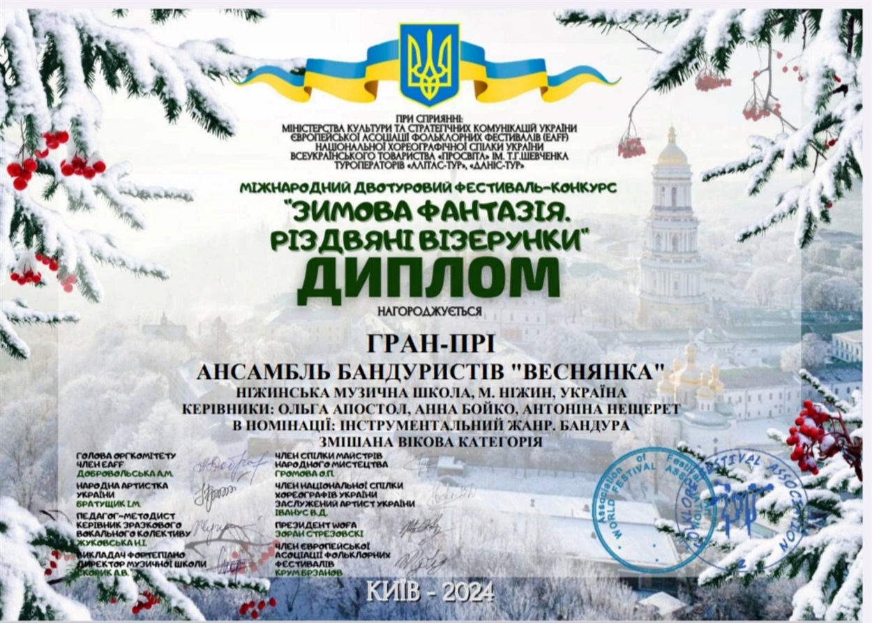 Ансамбль бандуристів "ВЕСНЯНКА" Ніжинської музичної школи здобув ГРАН-ПРІ в Міжнародному двотуровому фестивалі-конкурсі "ЗИМОВА ФАНТАЗІЯ. РІЗДВЯНІ ВІЗЕРУНКИ"! (Київ). За вершинні досягнення творчого колективу завдячуємо його керівникам - Ольга АПОСТОЛ, Анна БОЙКО, Антоніна НЕЩЕРЕТ. Зичимо натхнення і нових творчих звершень! - повідомляє музична школа.
