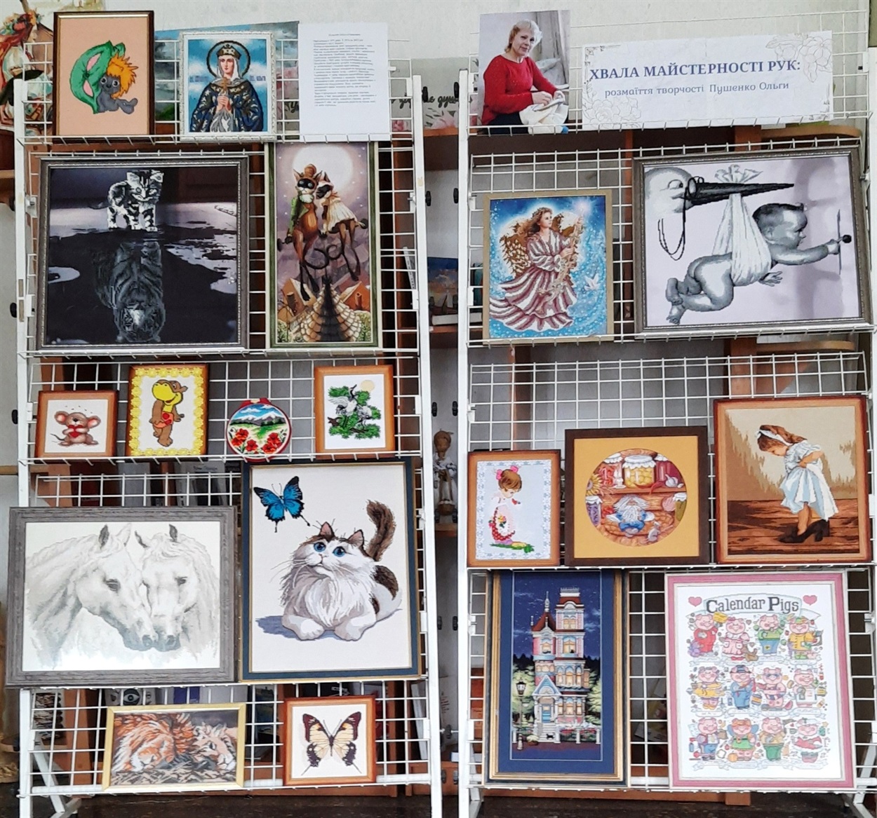 На абонементі центральної бібліотеки відкрилася виставка вишитих картин "ХВАЛА МАЙСТЕРНОСТІ РУК: розмаїття творчості Пушенко Ольги".Тут котики і лелеки, коні й бегемотик, домовичок і леви. Ще й календар свинок.