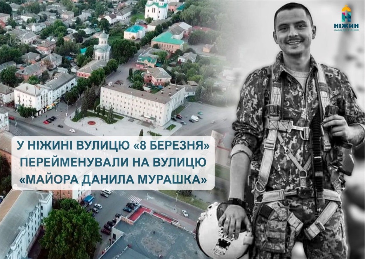 У Ніжині вулицю «8 Березня» перейменували на вулицю Майора Данила Мурашка. Депутати міської ради підтримали це рішення одноголосно після звернень родини, військових і громадськості.