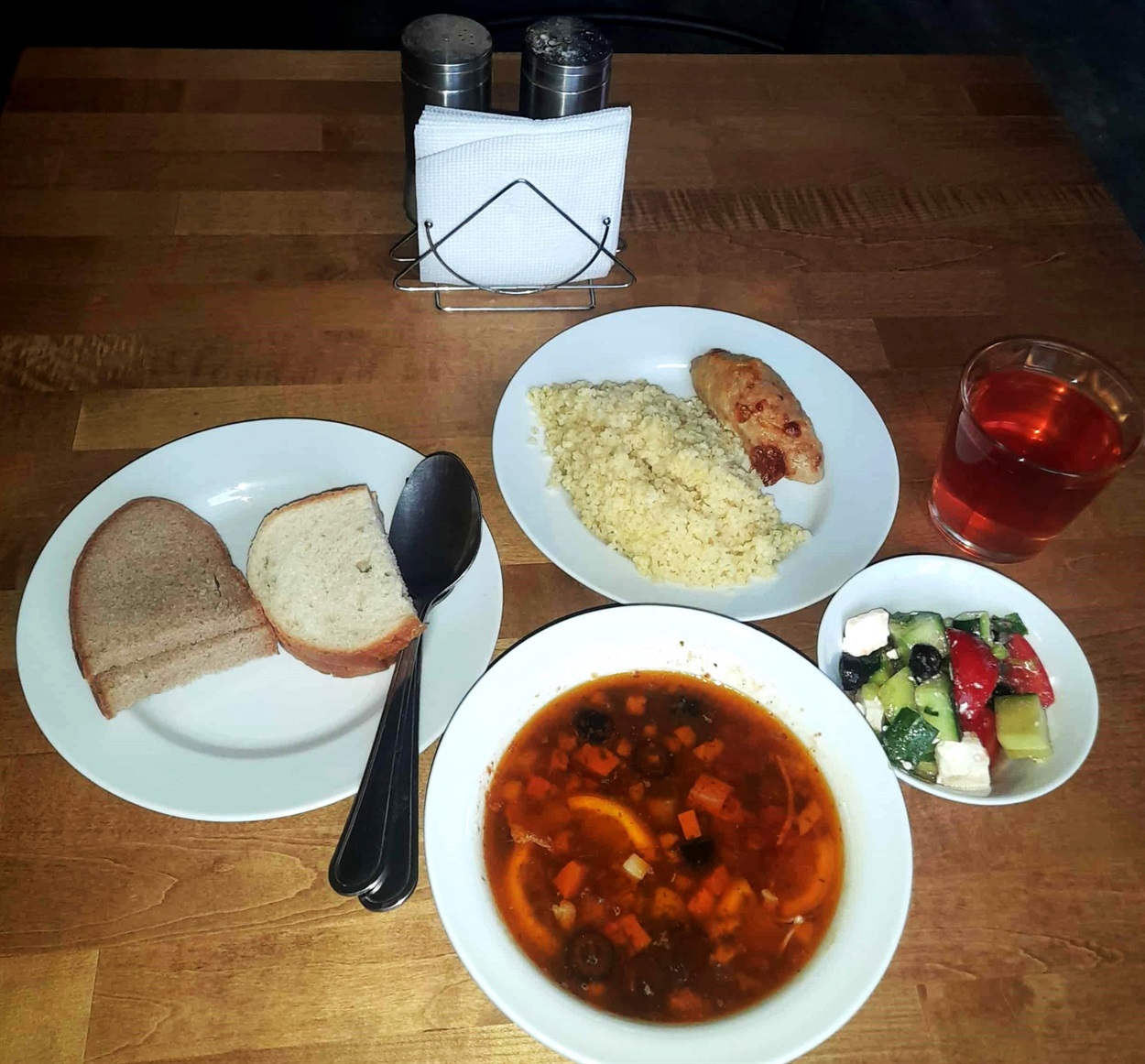 Власне, ми й самі у цьому переконалися, завітавши до кав'ярні. Того дня у комплексному меню були грецький салат, солянка на першу страву, булгур з котлетою на другу й узвар. Можна було ще замовити десерт, каву, чай або сік. Також у вітрині - широкий вибір булочних і кондитерських виробів. Звісно, скуштувати все з представленого асортименту було не під силу, але те, що, як то кажуть, «подужали», було дуже смачне. Солянка – як домашня, овочевий салат у жодному разі не поступався ресторанному, найкращих слів заслуговували й булгур з котлетою. Під стать їм були й запашна кава з неймовірними тістечками та, вважай, майже домашнім і дуже-дуже знайомим багатьом з нас сметанно-желейним десертом «бите скло». Ми попросили дозволу у Лариси Леонідівни зробити кілька знімків їхніх виробів. Хоч вони й не передадуть усієї повноти смаків та ароматів випічки та страв, однак дуже вже нам хотілося поділитися ними на сторінках часописів нашої медіа-групи.