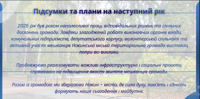 <p class="article-img"><img alt="" class="img-responsive" src="/upload/article/o_1jc42cq81126216opumj1c0kj3154.png" /></p> <p>&nbsp;</p> <p class="article-img"><img alt="" class="img-responsive" src="/upload/article/o_1jc429mcq1c1b15rt4nm17d014bq1r.png" /></p> <p class="article-img"><img alt="" class="img-responsive" src="/upload/article/o_1jc42a5a24a39c1njnsan1ktc2a.png" /></p> <p class="article-img"><img alt="" class="img-responsive" src="/upload/article/o_1jc42af9ptsa18f1vq815mjhmv2p.png" /></p> <p class="article-img"><img alt="" class="img-responsive" src="/upload/article/o_1jc42atcqg5h1rge6tt1spu1mlj38.png" /></p> <p class="article-img"><img alt="" class="img-responsive" src="/upload/article/o_1jc42b9vhpvv11pggsu1kq11eci3n.png" /></p> <p class="article-img"><img alt="" class="img-responsive" src="/upload/article/o_1jc42bksrefg1q1gjg517m315fv46.png" /></p> <p class="article-img"><img alt="" class="img-responsive" src="/upload/article/o_1jc42f4e72tr1dnb107tqgv18nr5j.png" /></p> <p class="article-img"><img alt="" class="img-responsive" src="/upload/article/o_1jc42fh8lhkboba2gklau1m0a62.png" /></p> <p class="article-img"><img alt="" class="img-responsive" src="/upload/article/o_1jc42fs93b1fm9pbbksu216lu6h.png" /></p> <p class="article-img"><img alt="" class="img-responsive" src="/upload/article/o_1jc42k8lr16ol13jpe2u1juegt17u.png" /></p> <p class="article-img"><img alt="" class="img-responsive" src="/upload/article/o_1jc42kl4cpp11mq32oev731qo88d.png" /></p> <p class="article-img"><img alt="" class="img-responsive" src="/upload/article/o_1jc42ktc61enf1l3j5221p065ab8s.png" /></p> <p class="article-img"><img alt="" class="img-responsive" src="/upload/article/o_1jc42l82l1d5iu28t4ejij1epp9b.png" /></p> <p class="article-img"><img alt="" class="img-responsive" src="/upload/article/o_1jc42ll2b1i865487galm117sh9q.png" /></p> <p class="article-img"><img alt="" class="img-responsive" src="/upload/article/o_1jc42m0331q6irct15q91h11i70a9.png" /></p> <p class="article-img"><img alt="" class="img-responsive" src="/upload/article/o_1jc42mb221qhk75tlo1g221scoao.png" /></p> <p class="article-img"><img alt="" class="img-responsive" src="/upload/article/o_1jc42mm9eorbkmp12u21dl05l3b7.png" /></p> <p class="article-img"><img alt="" class="img-responsive" src="/upload/article/o_1jc42murgti212n51gt114vu15vbm.png" /></p> <p class="article-img"><img alt="" class="img-responsive" src="/upload/article/o_1jc42n7am13fi1etn1a411sqj540c5.png" /></p> <p class="article-img"><img alt="" class="img-responsive" src="/upload/article/o_1jc42ngmu1tk4qcm1va8d281mf0ck.png" /></p> <p class="article-img"><img alt="" class="img-responsive" src="/upload/article/o_1jc42ns3583d1ste1q7n1n541v4vd3.png" /></p> <p class="article-img"><img alt="" class="img-responsive" src="/upload/article/o_1jc42o871ndlct3m34ckc1og8di.png" /></p> <div class="mc-text-readmore"><a href="/blogs/446208/zvit-miskogo-golovi-nizhina-pro-robotu-v-2025-roci-video" target="_blank">Звіт міського голови Ніжина про роботу в 2025 році. Відео</a><img src="/upload/article/res/120-80/o_1jc44ae3t18l8kp6ku42qa1baa35.jpg" /></div> <p>&nbsp;</p>