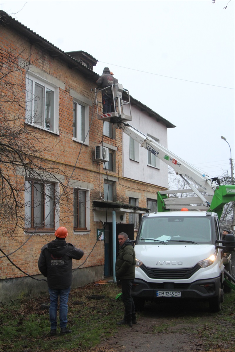 На знімках: енергетики Ніжинського РЕМу машиніст Анатолій Ярмак, електромонтери Сергій Леміш Андрій Несин; майстер ДЕМ №3 Дмитро Білоус з електромонтерами Євгеном Ревою та Миколою Бокачем.
