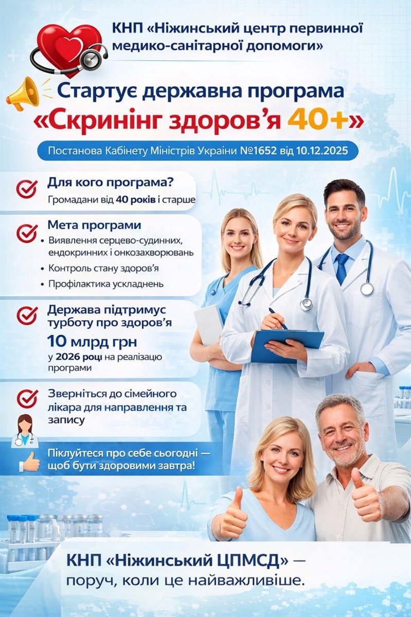 Відповідно до Постанови Кабінету Міністрів України від 10.12.2025 №1652, у закладі на всіх 10 амбулаторіях розпочато реалізацію державної програми «Скринінг здоров’я 40+».