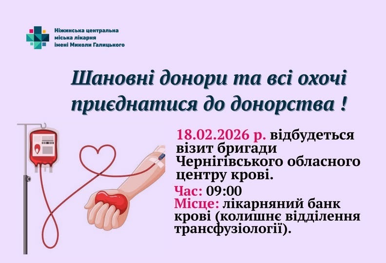 Час: 09.00. Місце: лікарняний банк крові (колишнє відділення трансфузіології Ніжинської центральної міської лікарні).