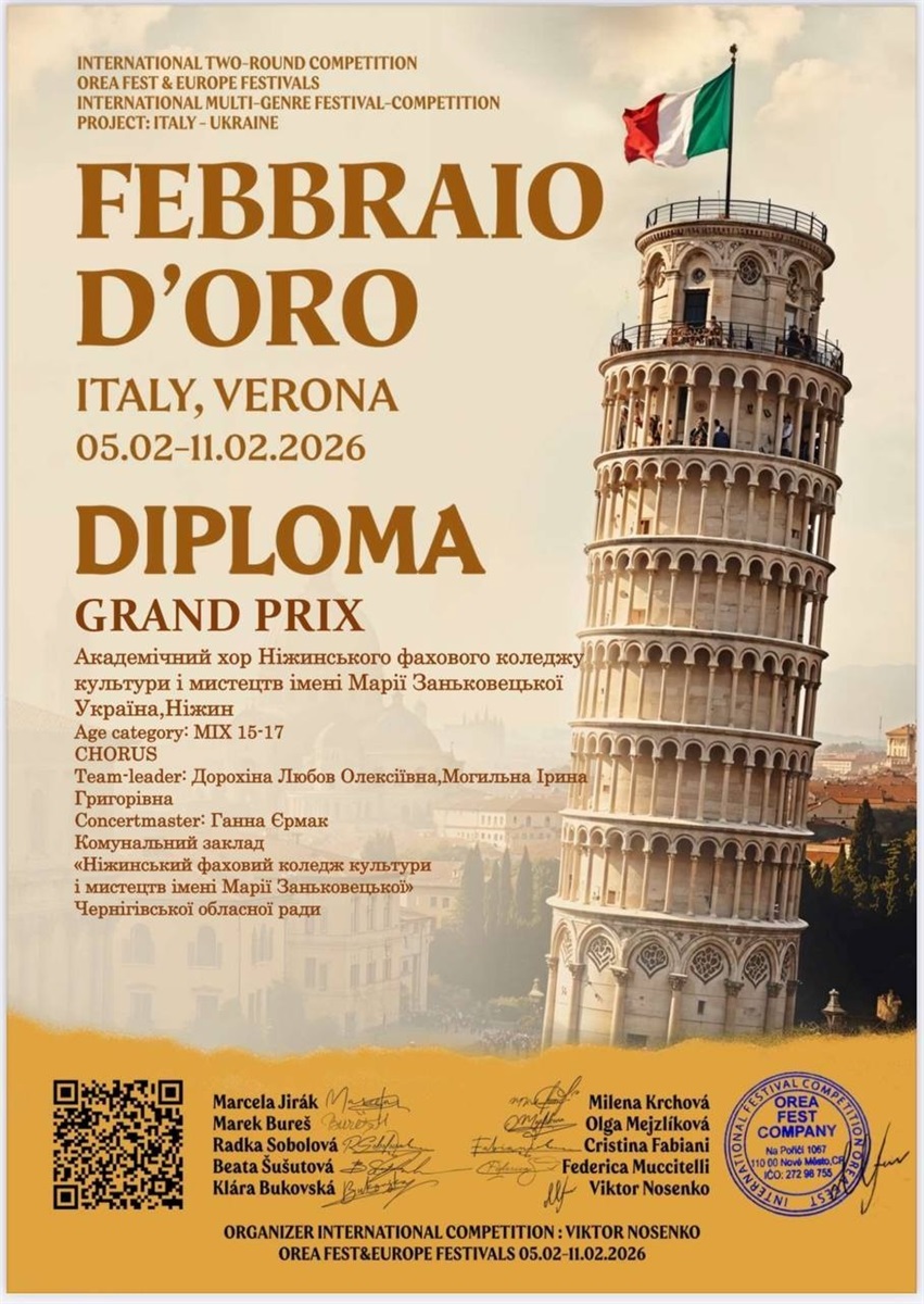 Академічний хор Ніжинського фахового коледжу культури і мистецтв імені Марії Заньковецької здобув найвищу нагороду – Grand Prix на престижному міжнародному двотуровому конкурсі «Febbraio d’Oro», який відбувся 05-11 лютого 2026 року в місті Верона (Італія). Повідомляє КЗ Ніжинський фаховий коледж культури і мистецтв імені Марії Заньковецької