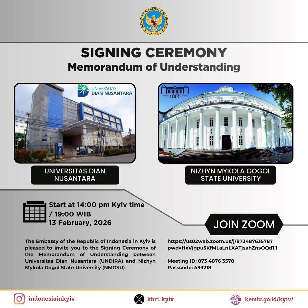 13 лютого 2026 року відбулася урочиста церемонія підписання Меморандуму про взаєморозуміння між Ніжинським державним університетом імені Миколи Гоголя та Університетом Діан Нусантара (Universitas Dian Nusantara, Індонезія). Захід організовано за особистого сприяння Надзвичайного і Повноважного посла Республіки Індонезія в Україні Й.В. пана Аріфа Мухаммеда Басалами та проведено у приміщенні Посольства у змішаному форматі за участі представників обох закладів освіти, співробітників диппредставництва.