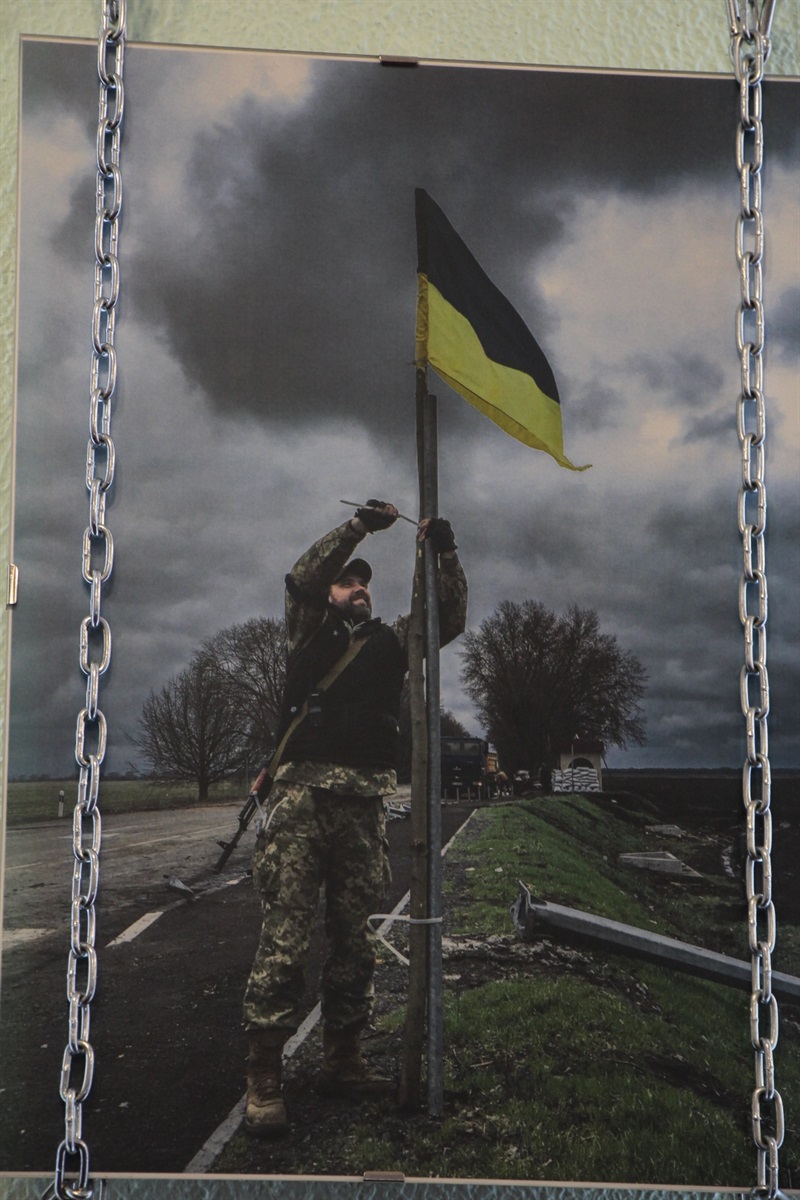 В експозиції – документальні світлини фотомитців, зафіксовані ними у Ніжині у перші дні вторгнення та на підступах до міста, порожні полиці магазинів, довжелезні черги біля банкоматів та аптек, розпач жителів перед невідомістю й водночас силу взаємної підтримки, яку вони отримували від волонтерів та благодійників, від релігійних громад.