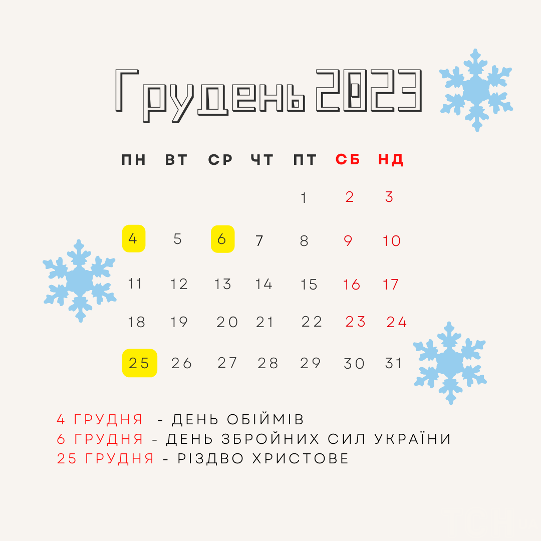 В грудні традиційно 31 день, а саме 2023 року 21 робочий день та 10 – офіційних вихідних (субота й неділя).