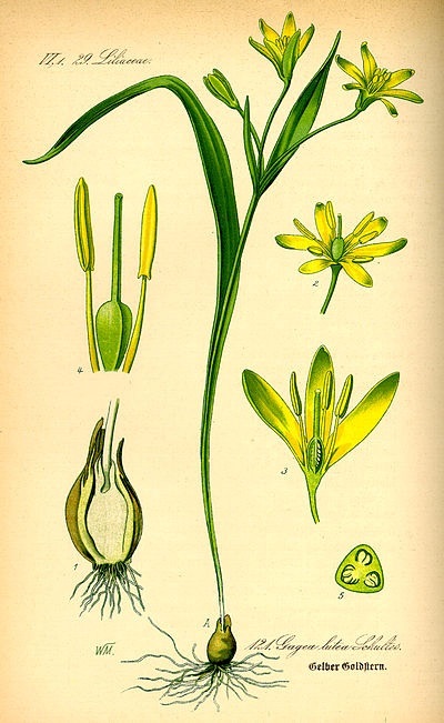 Гусяча цибулька (Gagea lutea) – це багаторічна низькоросла цибулинна рослина сімейства лілейних. Народні назви: жовтоцвіт, жовтий пролісок, гадюча цибуля, гусятник, пташина цибуля. Родова латинська назва походить від прізвища англійського ботаніка-любителя Томаса Гейджа (Thomas Gage). А чому ж цю рослину назвали «гусячою цибулькою»? В літературі з цього приводу наводиться таке пояснення: «Колись її на луках і лісових галявинах було дуже багато. І старі люди розповідали, що весною на ці луки і галявини завжди опускалися зграї диких гусей, щоб перепочити тут після важкої дороги і пощипати сходи зелені, яку вони дуже любили».