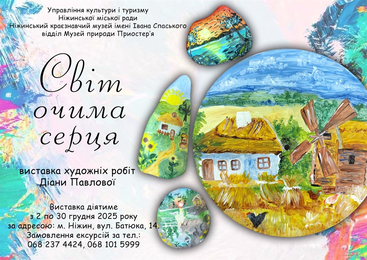 У відділі Музей природи Приостер’я Ніжинського краєзнавчого музею імені Івана Спаського з 2 грудня 2025 року розпочне діяти виставка авторських робіт юної художниці ДІАНИ ПАВЛОВОЇ «СВІТ ОЧИМА СЕРЦЯ».