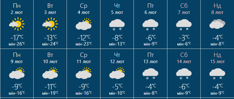 Невеликий сніг. Температура 7 лютого вночі 4-9º, вдень 0-5º морозу, 8 лютого вночі 7-12º, вдень 4-9º морозу.