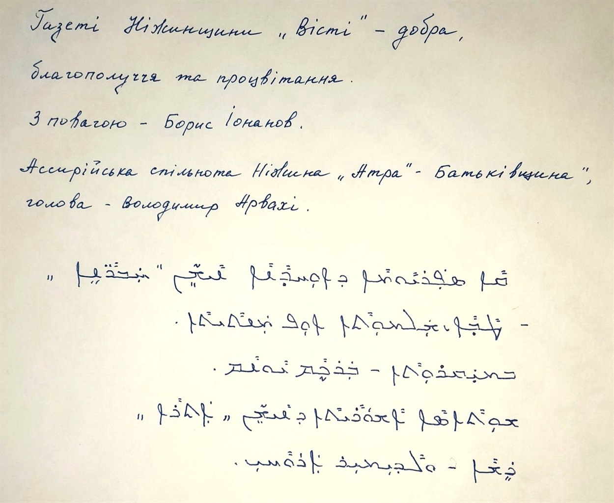 -До недавнього часу в Україні проживало близько трьох тисяч ассирійців, - розповідає. – У Запоріжжі випускалася єдина ассирійська газета «Харбе д-атурає», що у перекладі означає «Ассирійські новини». Наша ніжинська громада, яка нараховує близько 120 чоловік, заснувала міську організацію Ассирійців «Атра» («Батьківщина»). Мені приємно визнавати, що я впорядником кількох тематичних словників, які були випущені у 2016, 2017 роках, а також автором Ассирійських казок та оповідань, виданих, до речі, українською мовою у 2012 році. Аналогів такої літератури в Україні більше немає. Зараз працюю над перекладом Біблії 1893 року випуску з Старим та Новим Завітом та Давидовими Псалмами– мені її подарувала наша знайома ассирійка…